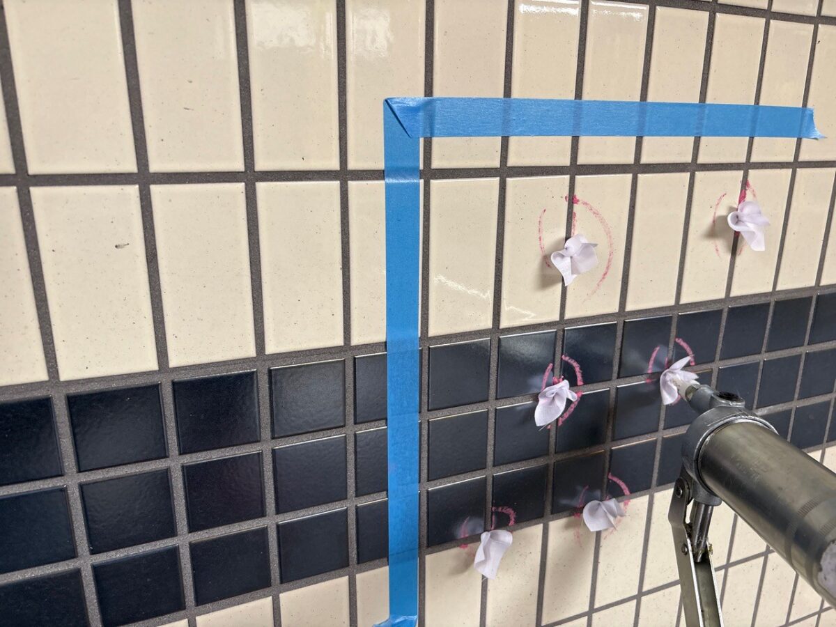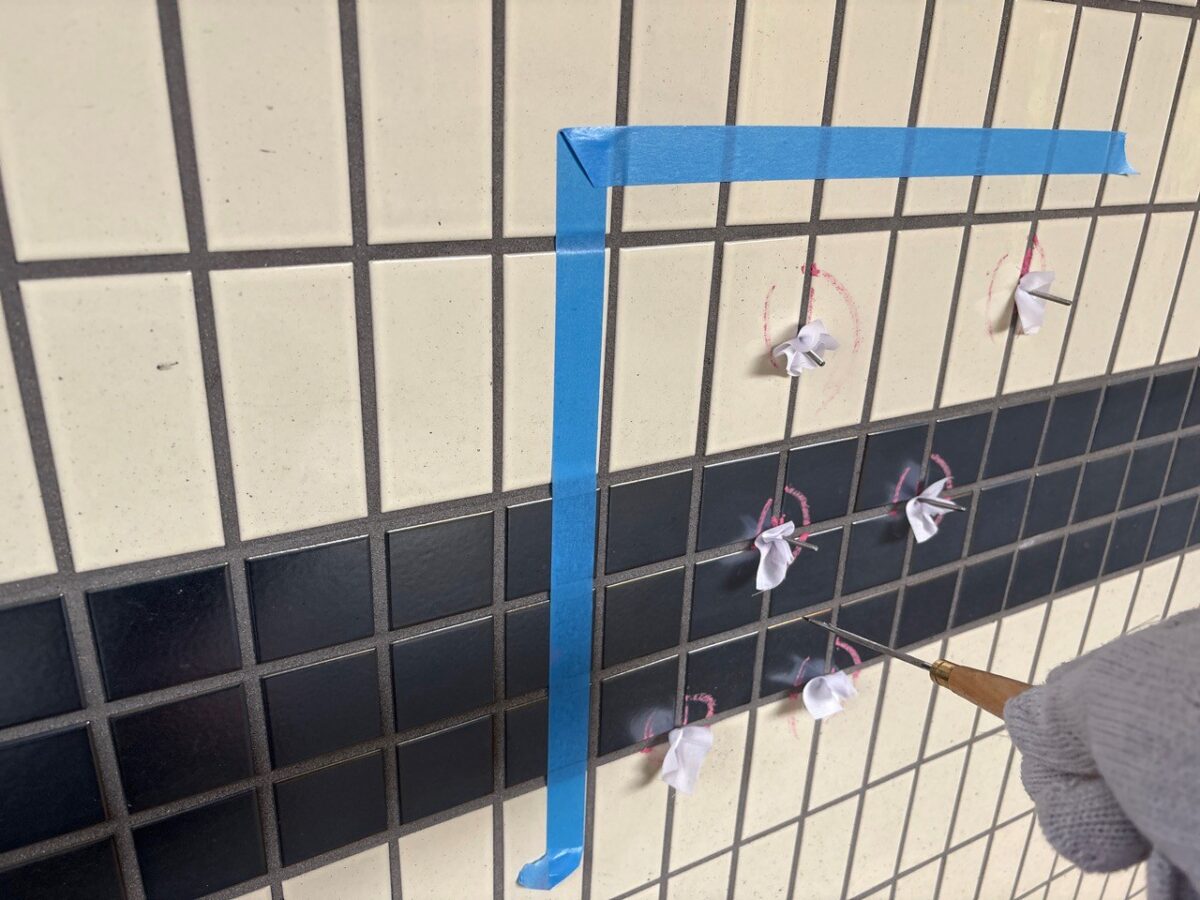 まず打診棒でタイルを叩き、中空音で浮き範囲を特定し、範囲が決まったら樹脂注入位置を決め、ドリルで穴を開けます。