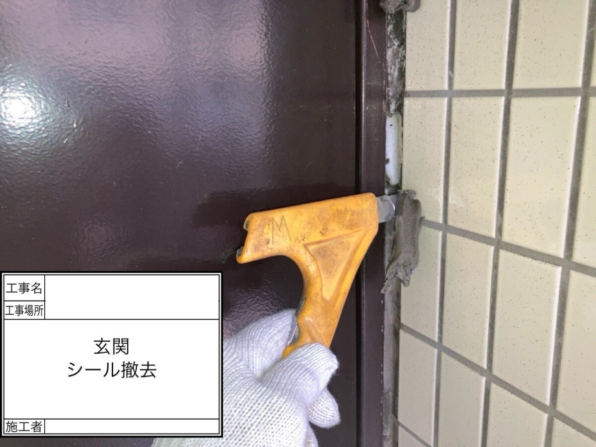 最初にご紹介するのは、玄関ドア前の外壁部分のシーリング打ち直しです。