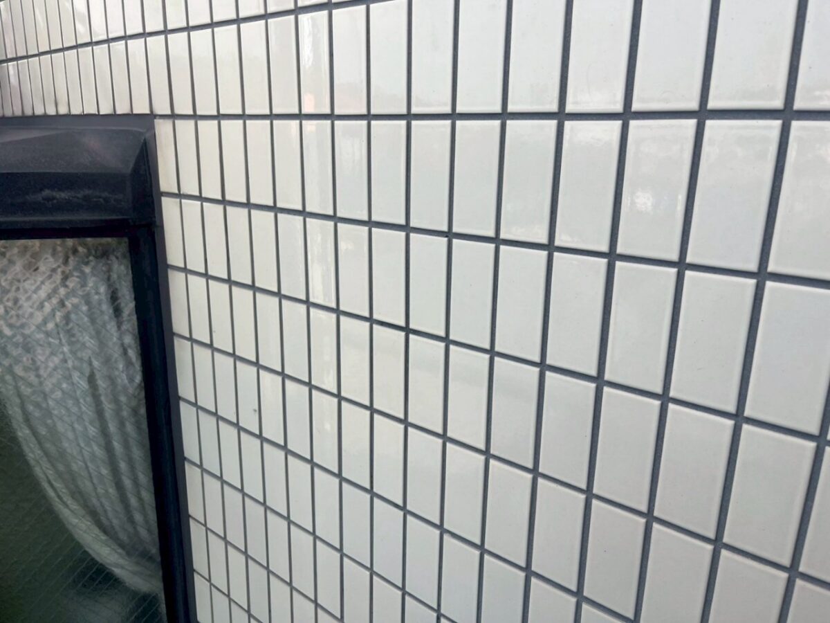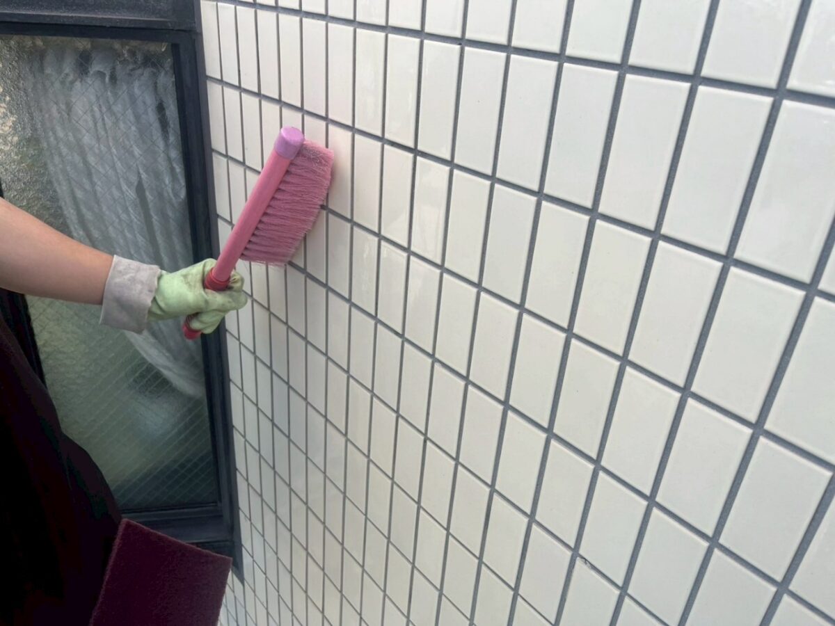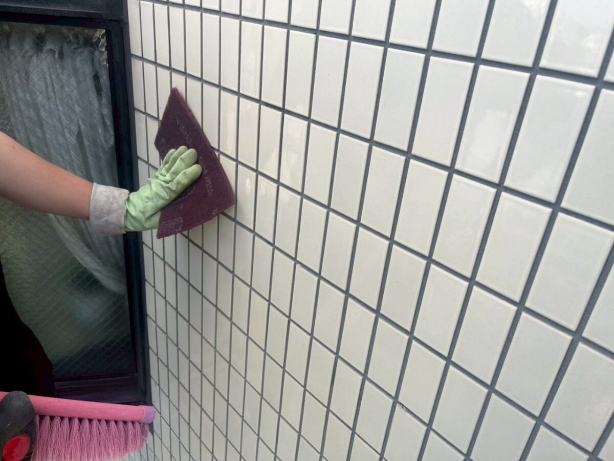 シーリング工事が終了したら、タイル壁の汚れを薬品で落とします。