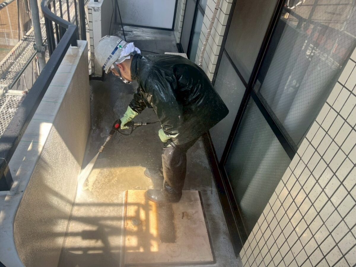 今回は、高圧洗浄後に防水工事も行いますので、ごみなどはもちろんですが、砂埃なども残