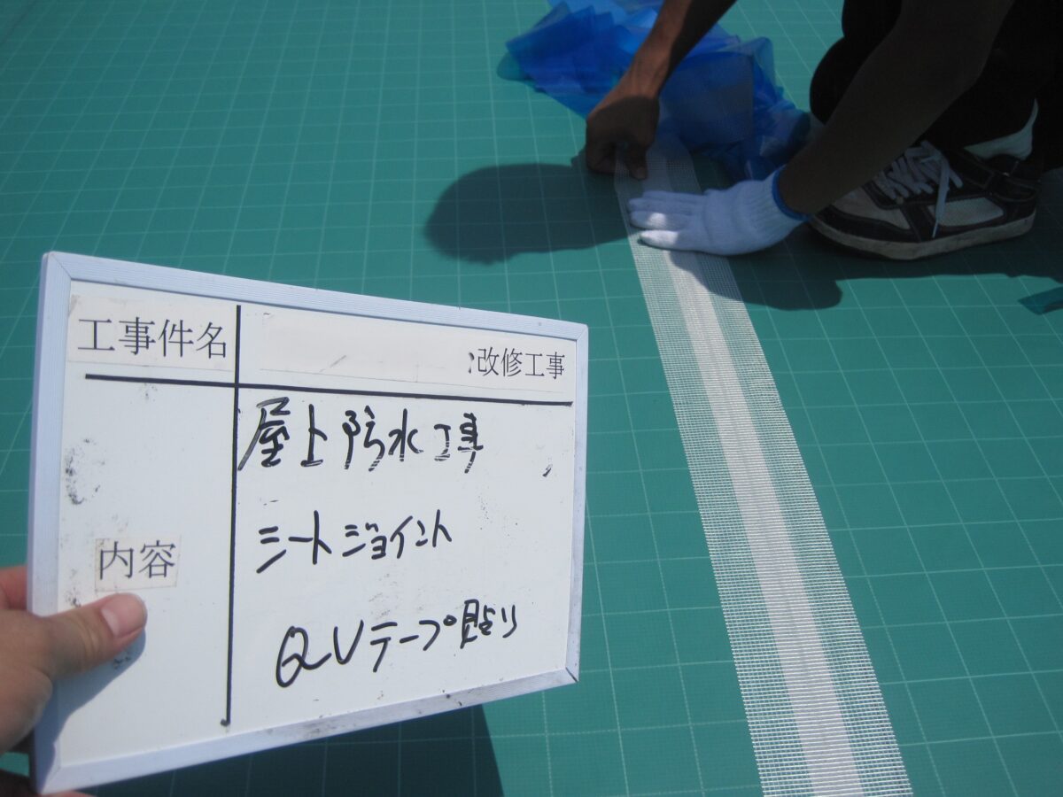 シートジョイント部のQVテープ貼りと端部へのMBテープ貼りも、密閉性を高めるための重要な工程。この処理が甘いと、水や空気がシート下に入り込み、せっかくの防水層が膨れてしまう恐れがあります。見た目以上に、技術力が問われる繊細な作業です。